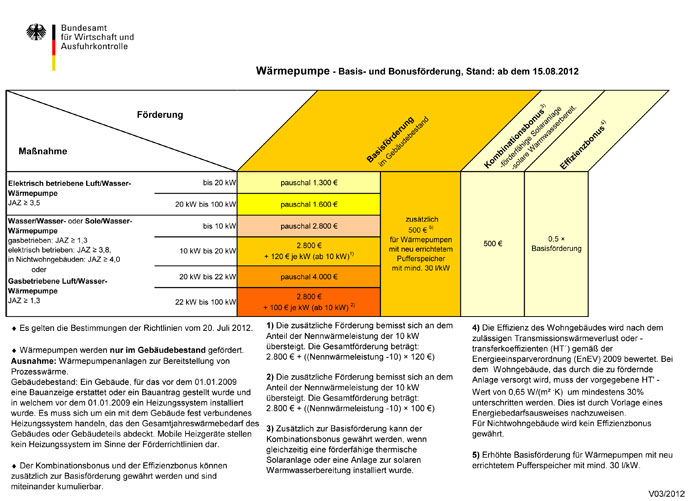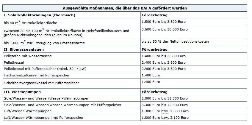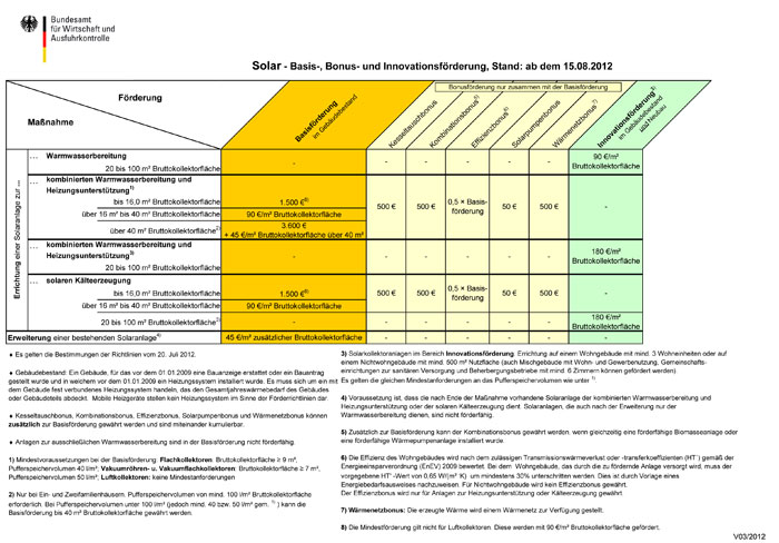 Ab dem 15. August 2012 sind die Zuschüsse für Solaranlagen (thermisch), Biomasseanlagen und Wärmepumpen in 1- und 2-Familienhäusern, in Mehrfamilienhäusern sowie in gewerblichen und öffentlichen Gebäuden deutlich erhöht worden.